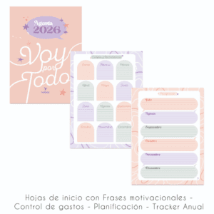 - INTERIOR CON HOJAS DE INICIO CON FRASES MOTIVACIONALES, CONTROL DE GASTOS, PLANIFICACIÓN, TRACKER ANUAL Y MÁS