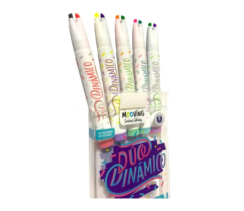 Descubre la versatilidad y calidad de los Resaltadores Mooving Duo Dinamico Doble Punta X 10 Colores. Este pack incluye 5 resaltadores, cada uno con doble punta biselada, ofreciendo un total de 10 colores intensos y de alta durabilidad. Fabricados con cuerpo de plástico resistente, estos marcadores son ideales para uso escolar y profesional. La tinta a base de agua garantiza un trazo suave y uniforme en superficies de papel. Cada resaltador cuenta con dos puntas biseladas, perfectas para subrayar y resaltar con precisión. Presentados en un práctico envase tipo blíster, estos resaltadores son la elección perfecta para quienes buscan calidad y funcionalidad en sus herramientas de escritura.