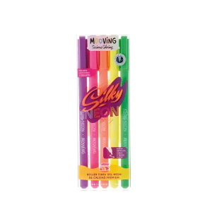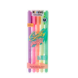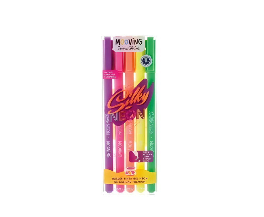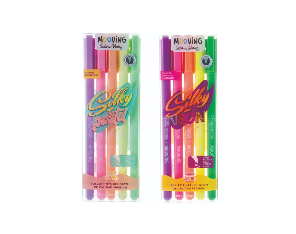 Contiene 5 roller tinta gel de colores neón con diseño exclusivo Mooving.